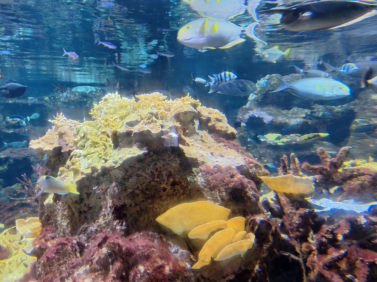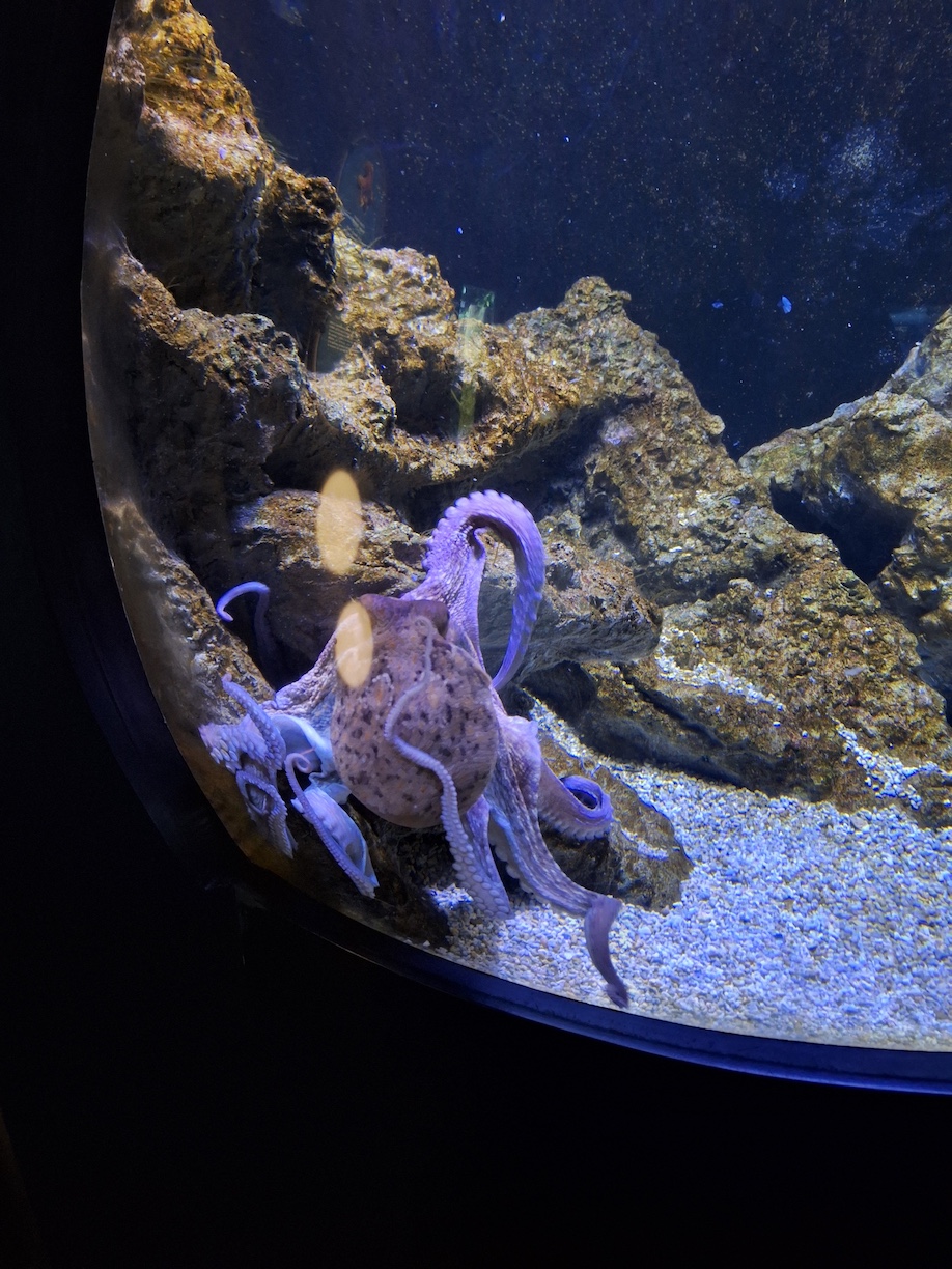 První expozice, kam zamířím, je L'Océan du Futur - Oceán budoucnosti. Navzdory názvu se výstava věnuje spíš minulosti, tedy vývoji různých rostlinných a živočišných druhů žijících ve vodě. Ale namísto nudných grafů čeledí a rodů jsou tam akvária. Mořští koníčci vypadají takhle. Chobotnice takhle. Krevety takhle. Celá expozice je instalována v zatemněné budově, takže člověk vidí jen nasvětlená akvária, a celé to působí velmi impozantně. Nejvíc se mi líbilo veliké akvárium s celým korálovým útesem a hejny ryb. Vlastně moc nevím, proč se lidi chtějí potápět, když takhle můžou kus moře šikovně dostat na souš. V expozici je navíc jako zvukový podkres puštěné bublání vody, což v kombinaci s rybami působí neuvěřitelně uklidňujícím dojmem. Seděla jsem tam hodnou chvíli.