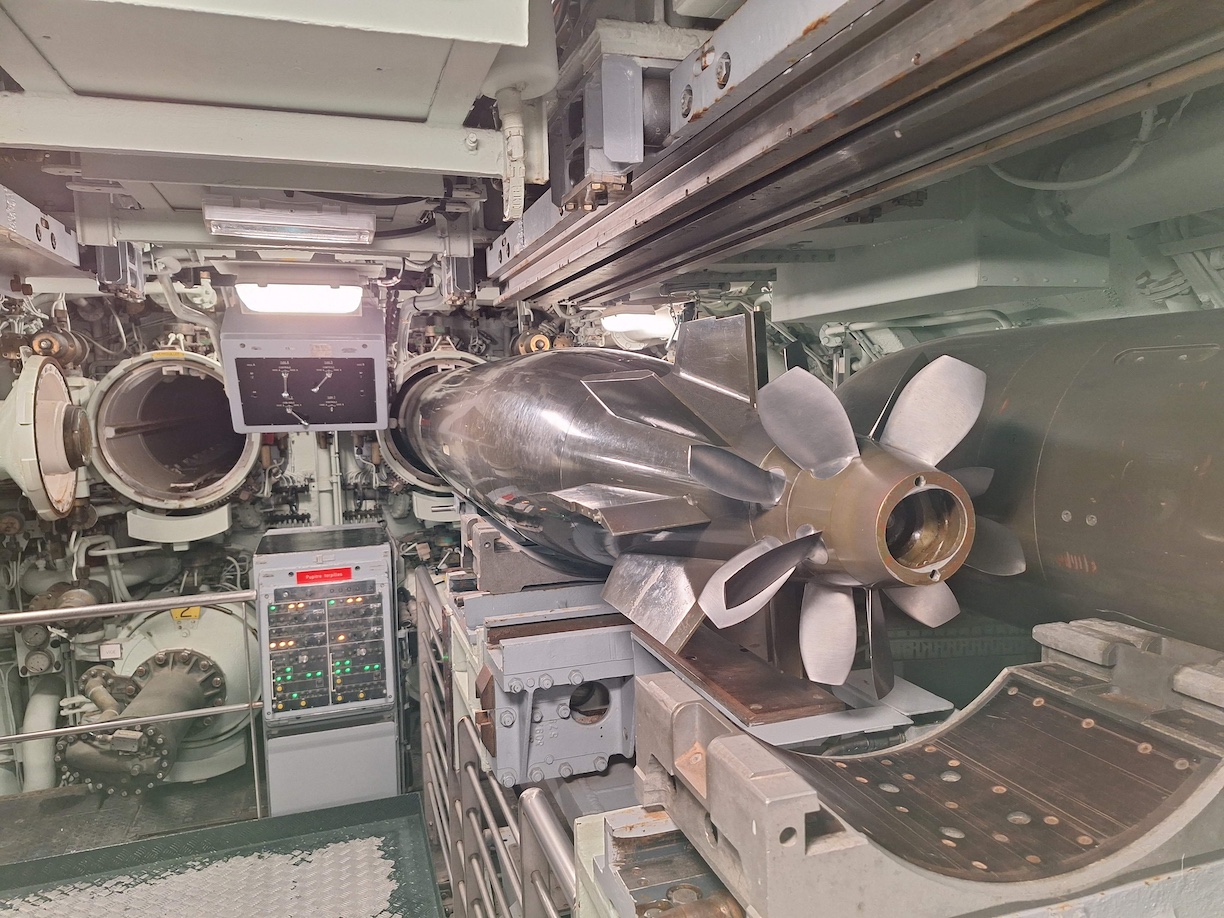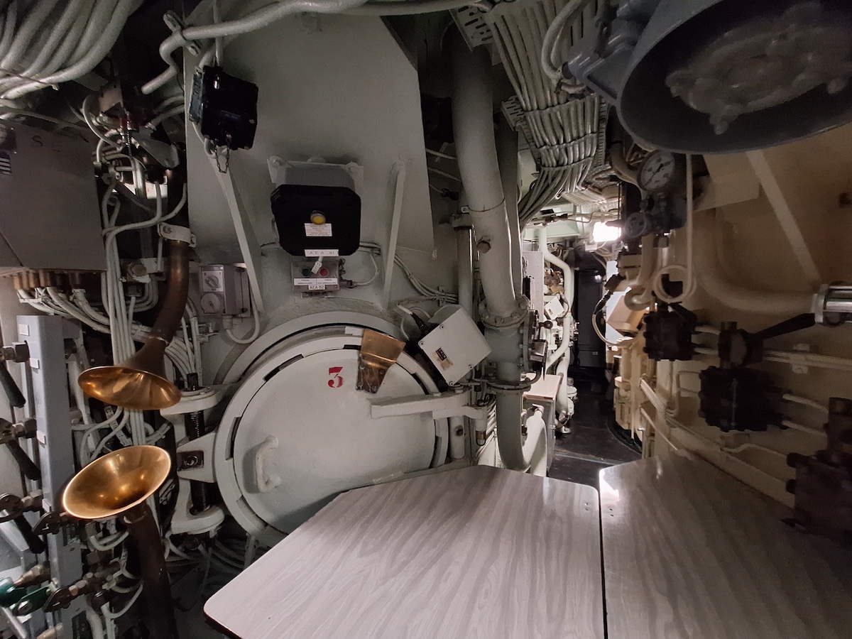 Zatímco v oceánské expedici se lidi v různých malých sálech rozptýlí (potkala jsem jich tam jen pár), ve druhé expozici - jaderné ponorce - se vzhledem ke stísněnému prostoru celkem nutně udělá zácpa. Ponorka Le Redoutable (což se dá přeložit jako obávaný nebo hrozivý) byla spuštěna v roce 1967, sloužila do roku 1985 a v roce 2000 se stala prvotním impulsem pro to, aby bylo v Cherbourgu Cité de la Mer vůbec otevřeno - měla být jeho hlavním exponátem. Jedná se o jedinou ponorku s balistickými střelami, kterou lze navštívit, ale vevnitř samozřejmě nejsou ani ty střely, ani jaderný reaktor, který byl s celou částí ponorky vyříznut a je nahrazen jen prázdným trupem. K ponorce je gratis audioprůvodce (ze kterého mi nejvíc utkvělo, že kombinace vesnice o sto třiceti lidech, jaderného reaktoru a výbušnin se nikde jinde na světě nevyskytuje, protože fakt není považována za dobrý nápad) a prohlídka nabídne člověku docela dobré nakouknutí, jak asi taková sedmdesátidenní mise stovky metrů pod mořskou hladinou mohla vypadat.