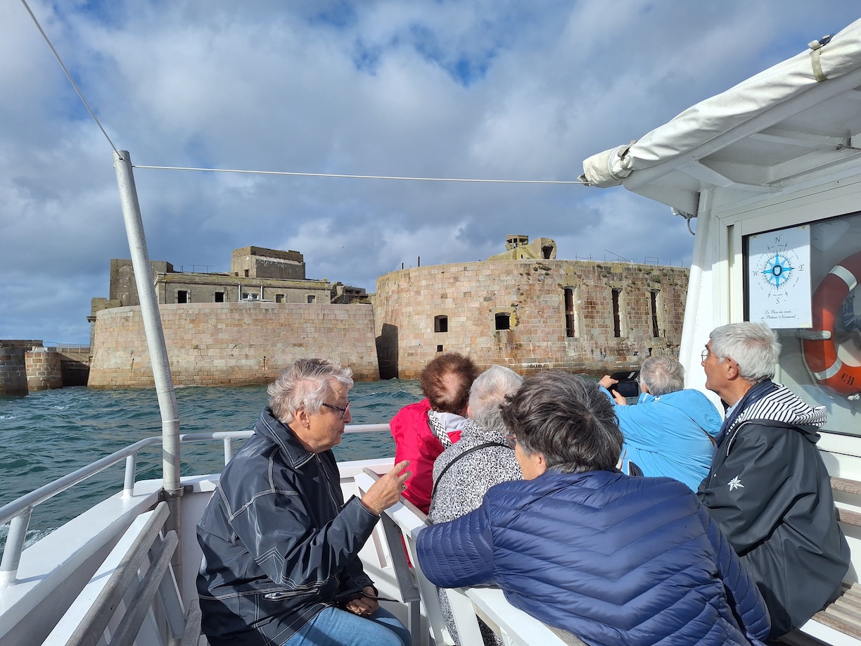 Ve skutečnosti mi tip na okružní plavbu připadá jako tak dobrý nápad, že na loď Adele naskočím ještě dnes odpoledne - staví u otočného mostu, přímo před domem. Loďka objíždí během jedenapůlhodinové plavby takzvanou la rade de Cherbourg, což je v češtině, jak jsem se dočetla na wikipedii, takzvaná rejda - tedy zátoka před přístavem. Aby byla co možná chráněná jak proti nepřízni počasí, tak proti případným výpadům nepřátel, začali ji ve druhé polovině 18. století opevňovat pevnůstkami přímo na moři a mezi nimi natahovat kamenné hráze. Efektivně se jim tak podařilo vytvořit nějakých patnáct čtverečních kilometrů velmi dobře chráněné vody, což je úctyhodný výkon. Největší zásluhy za to jsou připisovány Napoleonovi, ale se stavbou ve skutečnosti začal už Ludvík XVI. a svoji roli opevnění sehrálo ještě za druhé světové války. Dneska je, aspoň podle výhledu z lodi, v dost dezolátním stavu a hned vedle pevností je instalovaná lososí farma.
